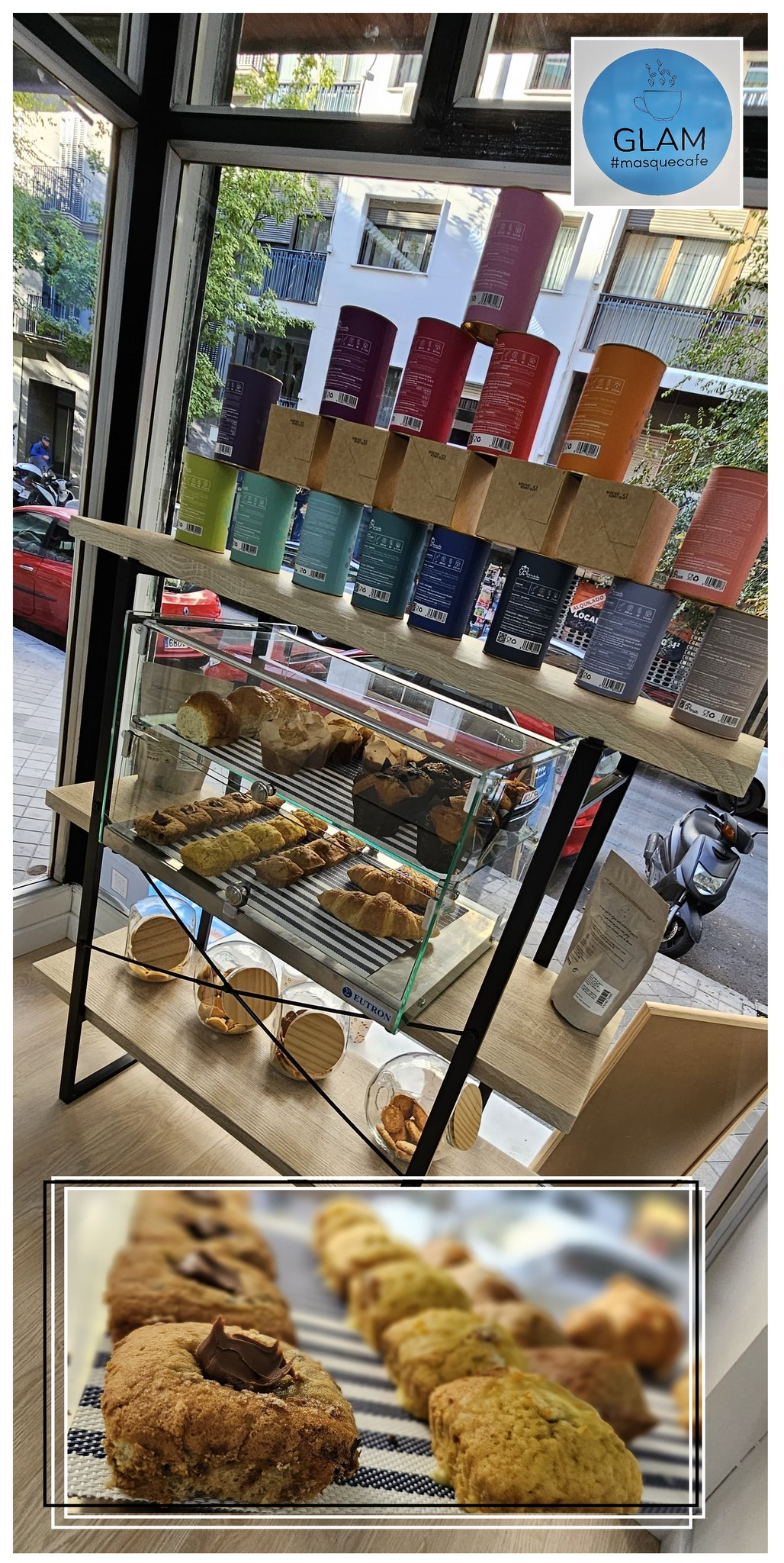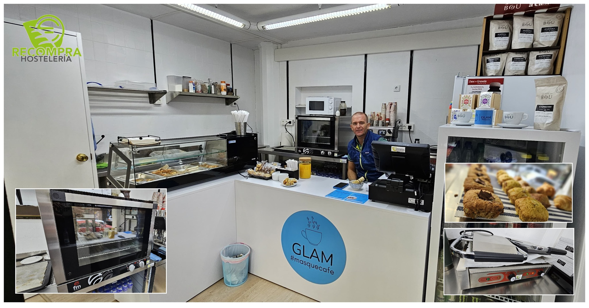 En Glam coffe encontraréis una amplia gama de cafés 100% naturales, y los podéis acompañar con todo tipo de aperitivos, muchos de ellos de elaboración propia (no dejéis pasar la oportunidad de probar los cuadraditos de plátano o zanahoria, son una pasada). Café para llevar y todo tipo de tés, todo hecho con mucho cariño a manos de Agustín al que le agradecemos desde aquí haber contado con Recompra Hostelería Granada para equipar su negocio.